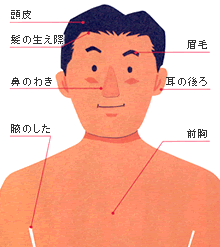 脂漏部位とは …頭、耳の周囲、顔、わきの下、ソケイブ(股)